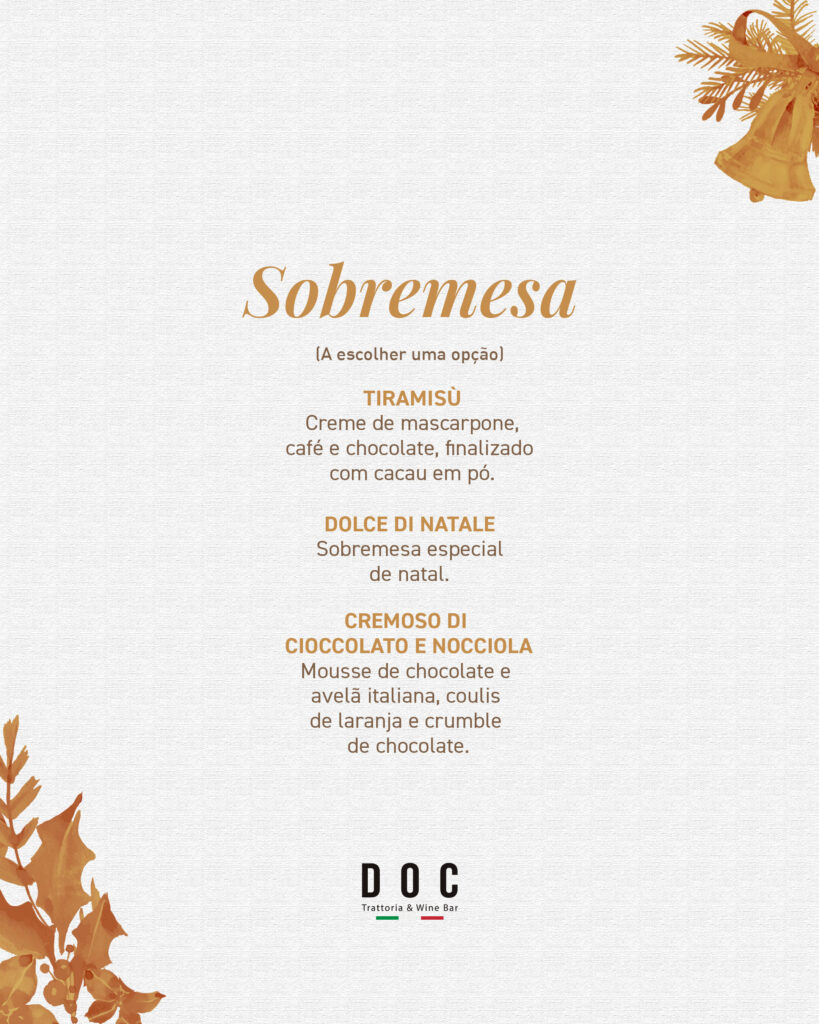 Para a véspera de Natal, o DOC apresenta um menu fechado e exclusivo, servido apenas no dia 24 de dezembro, composto por entrada, prato principal e sobremesa, desenvolvidos especialmente para a ocasião.
